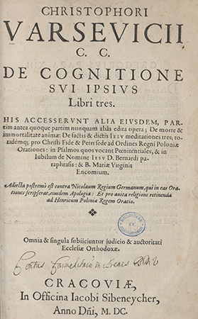 Christophori Varsevicii C. C. De Cognitione Svi Ipsivs Libri Tres. His Accesservnt Alia Eivsdem, Partim antea quoque partim nunquam alias edita opera [...]. - War B. - Cracoviae : In Officina Iacobi Sibeneycher, 1599 [IX.29 po] - 1600 [X.1 po]. - [6] kart, karty 1-163, [2] karty, karty 164-207, sygnowanie a⁶, A-Z⁴, Aa-Rr⁴, Ss⁶, Tt-Zz⁴, Aaa-Eee⁴, Fff₁-3 ; 2°.
