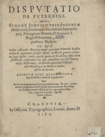 Acc.: Simoni Simone Qvadraginta septem theses eodem de argumento. Cum Indice praeciparum rerum pertractatarum. Ex quo, quam multa etiam cum Physiologiae tum medicinae theoremata isti disputationi affinia, in hoc opere pertractentur, cognoscere primo aspectur lector poterit. s.441-470.