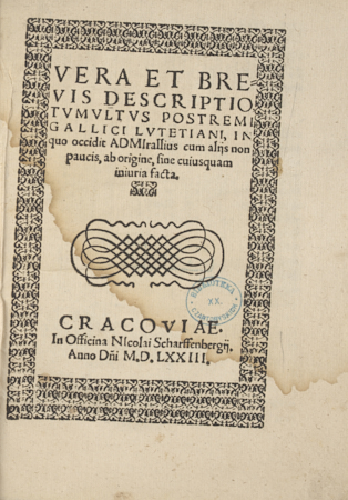 Gazeta ulotna zawierająca relację o wojnach religijnych we Francji, nocy św. Bartłomieja i zamordowaniu admirała Coligny.