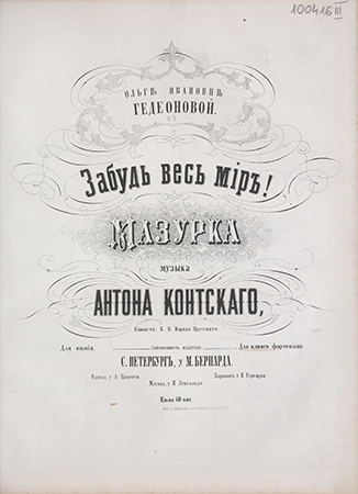 Zabud' vies' mir''! : Mazurka : Op. 215 / muzyka Antona Kontskago. - S. Peterburg'' : M. Bernard, [II poł. 19 w.]. - [2], (paginacja ciągła strony 218-221), [2] strony ; 30 cm.
