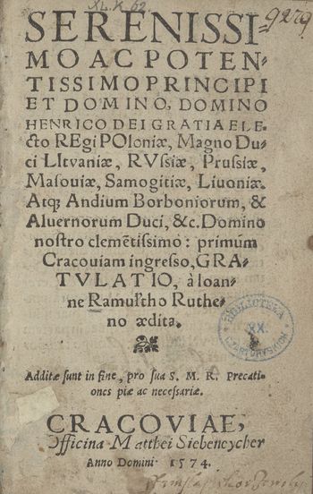 Dedykacja autora: Sereniss[imo] Et Potentiss[imo] Principi [...] Sigismvndo Avgvsto Iageloni [...].