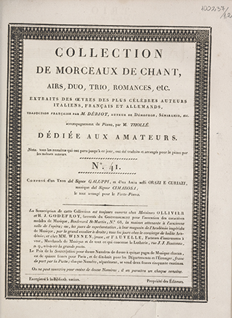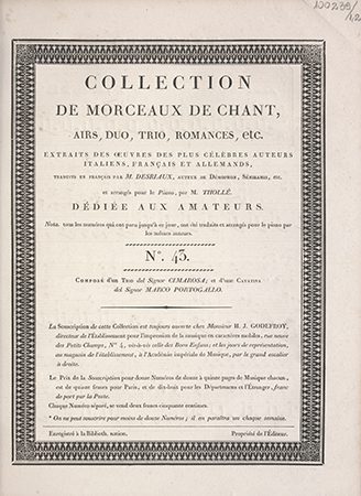 (Collection de morceaux de chant, airs, duo, trio, romances, etc. Extraits des oeuvres des célèbres auteurs [...] traduits en français par M. Desriaux, arrangé pour le piano par Thollé ; Nr 43)