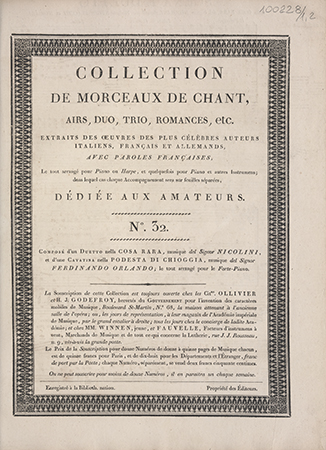 Scena e duetto nella Cosa rara / del Signor Nicolini. - Paris : Ollivier et H. J. Godefroy, [między 1804 i 1805]. - [1], 15 stron ; 34x26 cm.