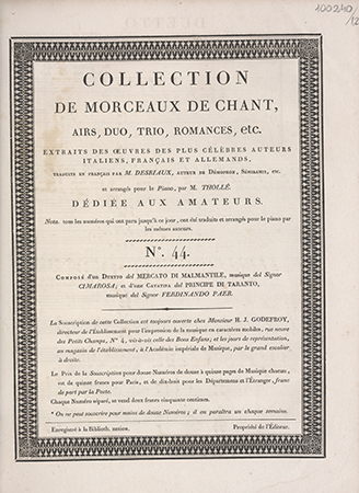 (Collection de morceaux de chant, airs, duo, trio, romances, etc. Extraits des oeuvres des célèbres auteurs [...] traduits en français par M. Desriaux, arrangé pour le piano par Thollé ; Nr 44)