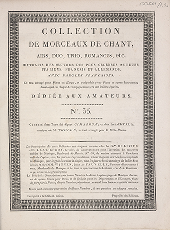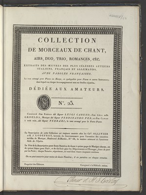 (Collection de morceaux de chant, airs, duo, trio, romances, etc. Extraits des oeuvres des plus célèbres auteurs [...] avec paroles françaises, le tout arrangé pour piano ou harpe et quelquefois pour piano [...] ; Nr 35)