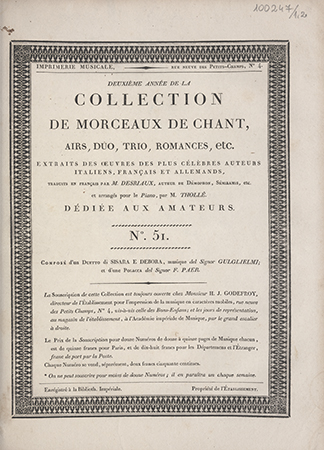 Duo di Sisara e Debora / del Signor Guglielmi. - Paris : Ollivier et H. J. Godefroy, [około 1805]. - [2], strony 29-41 ; 34x26 cm.