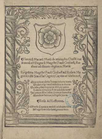 Paweł z Krosna Elegiacum penthametrum (...) ad Virginem Mariam, pro seussima peste abigenda. [3] karty, sygnowanie: B₄verso-B₆ recto.