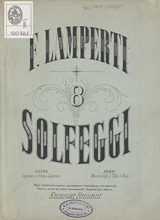 8 Solfeggi : secondo lo stile moderno / F. Lamperti. - Edizione trasportata un tono sotto mezzo soprano o tenore o baritono. - [Milano] : Edizione Ricordi, [1897]. - 47 stron ; 28 cm.