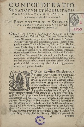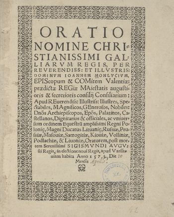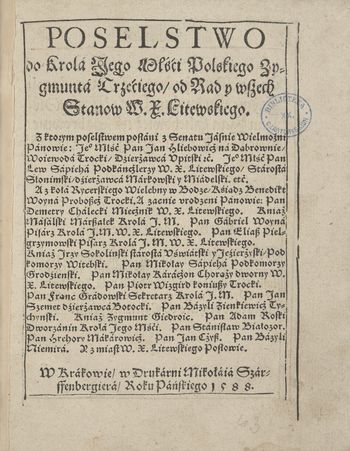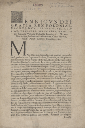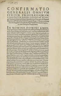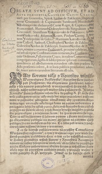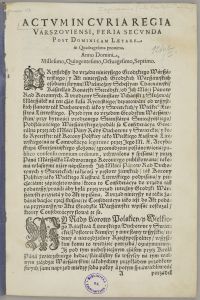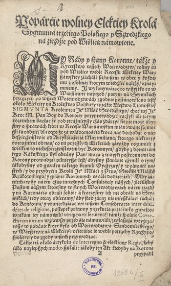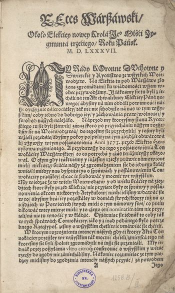 Reces warszawski : Około elekciey nowey Krola [...] Zygmunta trzeciego Roku Pańsk. M.D.LXXXVII. - Wydanie A. - [Kraków : Szarfenberger Mikołaj, po 19 VIII 1587]. - [6] kart, sygnowanie A⁶ ; 2°.