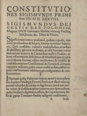 Constitvtiones Sigismvndi Primi, Anni Dni MD.XXXVIII. - [Kraków : Szarfenberger Mikołaj, około 1569]. - [24] karty , sygnowanie A-F⁴ ; 4°.
