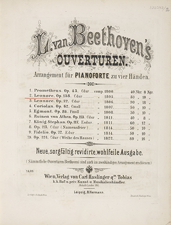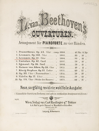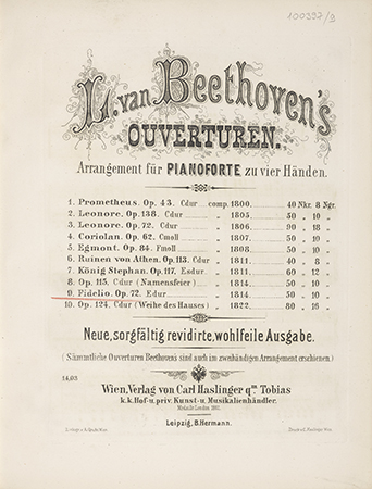 Ouverturen zur Oper : Leonore, (Fidelio) : Op. 72 componirt im Jahre 1806. - Neue, sorgfältig revidirte, wohlfeile Ausgabe. - Wien : Verlag von Carl Haslinger q.m Tobias, [między 1862 i 1868]. - 23 strony ; 32 cm.