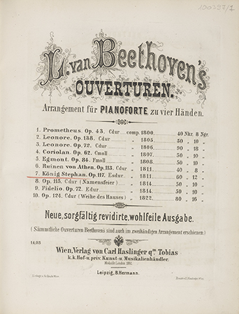 Ouverture zu den Ballet : Prometheus Op. 43. : componirt im Jahre 1800. - Neue, sorgfältig revidirte, wohlfeile Ausgabe. - Wien : Verlag von Carl Haslinger q.m Tobias, [między 1862 i 1868]. - 9 stron ; 32x25 cm.