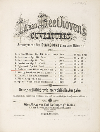 Ouverturen zu : Ruinen von Athen Op. 113 : componirt im Jahre 1811 / [Beethoven]. - Neue, sorgfältig revidirte, wohlfeile Ausgabe. - Wien : Verlag von Carl Haslinger q.m Tobias, [między 1862 i 1868]. - 9 stron ; 32x25 cm.