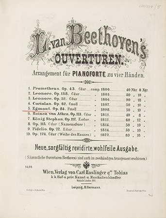 Ouverture zur Oper : Egmont Op. 84 componirt im Jahre 1810. - Neue, sorgfältig revidirte, wohlfeile Ausgabe. - Wien : Verlag von Carl Haslinger q.m Tobias, [między 1862 i 1868]. - 13 stron ; 32x25 cm.