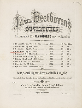 Ouverturen zur Oper : Coriolan Op. 62 : componirt im Jahre 1807 / [Beethoven]. - Neue, sorgfältig revidirte, wohlfeile Ausgabe. - Wien : Verlag von Carl Haslinger q.m Tobias, [między 1862 i 1868]. - 13 stron ; 32x25 cm.