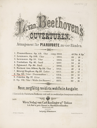 Ouverture zur : Namensfeier Op. 115 : componirt im Jahre 1814 / [Beethoven]. - Neue, sorgfältig revidirte, wohlfeile Ausgabe. - Wien : Verlag von Carl Haslinger q.m Tobias, [między 1862 i 1868]. - 13 stron ; 32x25 cm.