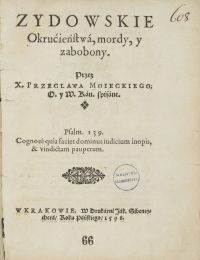 Żydowskie okrucieństwa, mordy, y zabobony / przez X. Przeclawa Moieckiego O. y W. Kan. spisane. - W Krakowie : W Drukarni Jak. Sibeneychera, 1598 [II 18 po]. - [4], 30 kart, sygnowanie )(⁴,A-G⁴,H₂ ; 4°.