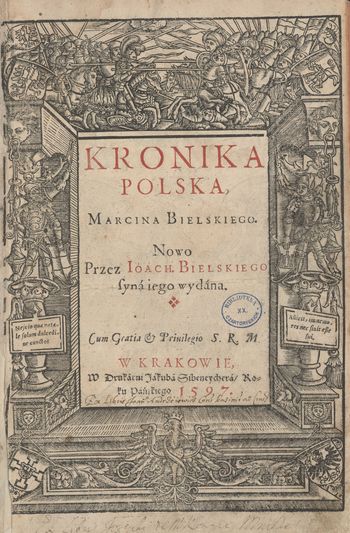 Kronika Polska, Marcina Bielskiego/ Nowo Przez Ioach. Bielskiego syna iego wydana. - W Krakowie : W Drukarni Jakuba Sibeneychera, 1597. - [6] kart, strony 1-804, [5] kart, sygnowanie )(⁶, A-Z⁶, Aa-Zz⁶, Aaa-Xxx⁶, Yyy₅ : ilustracje drzeworytowe ; 2°.