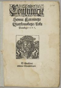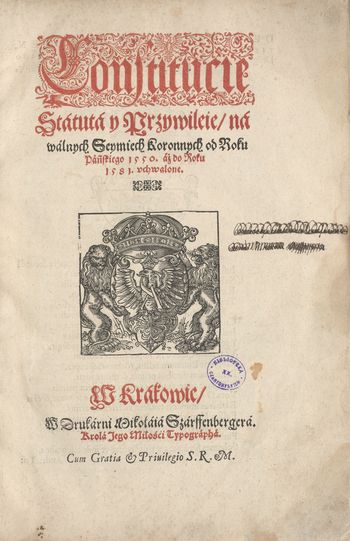 Constitucie statuta y przywileie, na walnych seymiech koronnych od roku Pańskiego 1550 aż do roku 1581 uchwalone. - W Krakowie : W Drukarni Mikołaia Scharffenbergera, [po 6 III] 1581. - 244 kart (k. [1-10], [1]2-7, [8], 9-18, [1-3], 18-153, [1 czysta], [154], 155-217, 219-228, 226, 230), sygnowanie []², *⁴, **⁴, A-D⁴, E⁸, F-Z⁴, Aa-Ee⁴, Ff⁶, Gg-Pp⁴, AAa-TTt⁴ ; 2°.