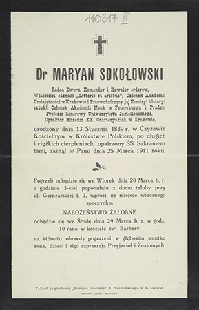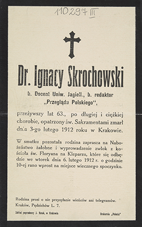 Zawiadomienie o pogrzebie na cmentarzu Rakowickim (Kraków) i nabożeństwie żałobnym w kościele św. Barbary (Kraków).