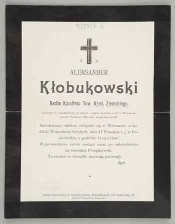 Zawiadomienie o pogrzebie na cmentarzu Powązkowskim.