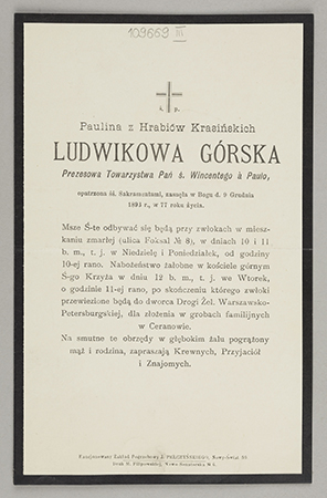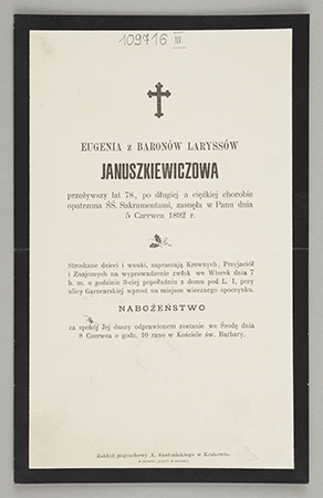 [Nekrolog. Incipit] Eugenia z baronów Laryssów Januszkiewiczowa przeżywszy [...]. - Kraków : Zakład Pogrzebowy A. Szafrański, [1892] (Kraków : Druk. "Czasu"). - [1] karta złożona ; 2x13 cm.