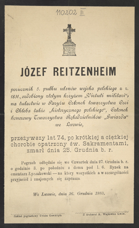[Nekrolog. Incipit:] Kazimierz Szetkiewicz b. Obywatel gubernji Wileńskiej [...]. - [Warszawa?] : Zakład Pogrzebowy Kaucjonowany J. Pełczyńskiego, 1898] (Warszawa : Druk M. Filipowskiej). - [1] karta złożona (4 strony) ; 21x14 cm.