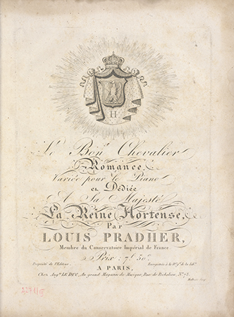 Na stronie tytułowej herb królowej Hortensji, wersja herbu Bonapartych z literą H pod tarczą.