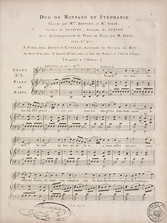 Tyt. okł.: La Dame Blanche, opéra-comique en trois actes, paroles de Scribe, musique de A. Boieldieu avec accompagnement de piano ou de harpe par L. Jadin. Ouverture, airs, duos, trios et choeurs