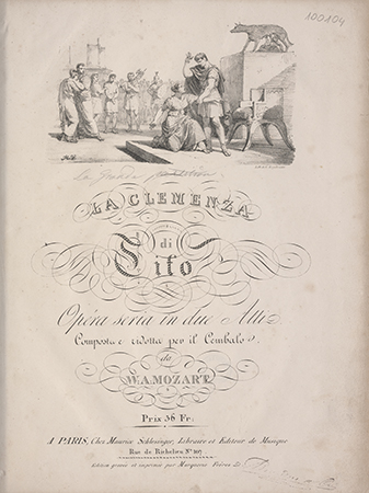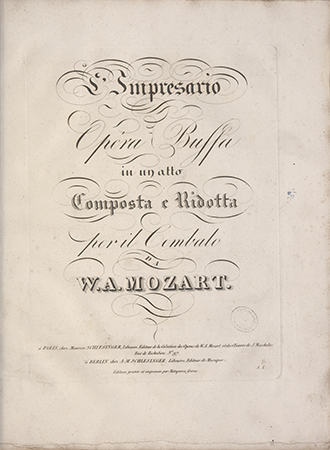 Tektura, papier marmoryzowny, grzbiet skóra bordowa, napis złocony: "Mozart-L'Impresario".