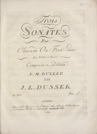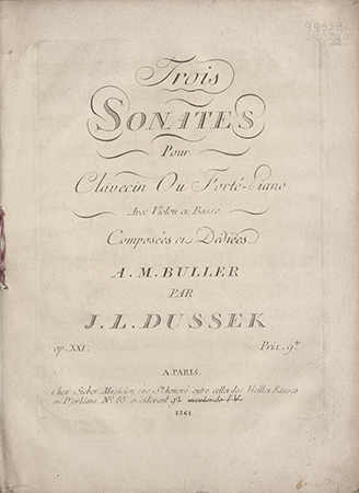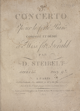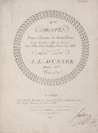 Tektura, papier zielony, na okładzinie górnej czerwona naklejka ze złotym szlaczkiem, z napisem złotymi literami: Concerto de Dussek et Steibelt.