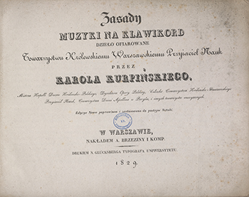 Zasady muzyki na klawikord : dzieło ofiarowane [...] / Karol Kurpiński. - Edycya nowa poprawiona i zastosowana do postepu sztuki. - Warszawa : nakł. A. Brzeziny i Komp., 1829 (Warszawa : N. Glücksberg). - [4], 70 stron ; 23x31 cm.