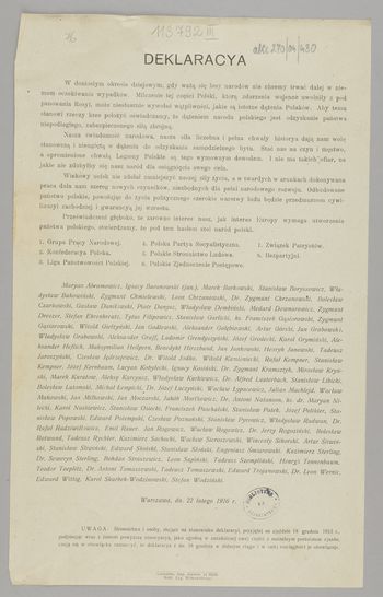 Deklaracya. - Lausanne : nakł. Zygmunta Witkowskiego, 1916 (Imp. Giessor et Held). - [1] karta ; 34x21 cm.