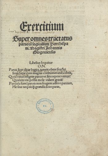 Exercitium super omnes tractatus paruoru[m] logicalium Petri Hispani / Magistri Iohannis Glogouiensis. - Impressu[m] Arge[n]tine : per Joanne Knoblouch, 20 III 1517. - [I] II-CV, [1 czysta] karta (pomyłki w foliacji), sygnowanie a-s⁸.⁴.⁴, t⁸ ; 4°.