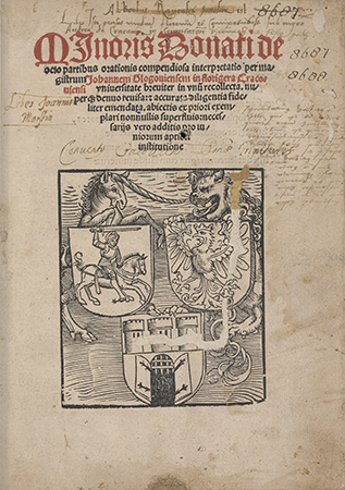 Druk gotycki, na karcie tytułowej recto drzeworyt symboliczny, wzorowany na Hallerze (herby: Polski, Litwy, Krakowa podtrzymywane przez jednorożca i lwa).