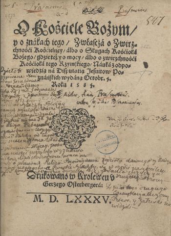 Strona tytułowa drukowana czerwono-czarno z datą: M. D. LXXXII. ; nad tytułem: "Ktora przedtym nigdy światła nie widziała".