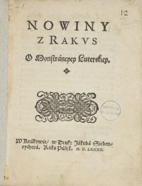 Nowiny z Rakvs O Monstráncyey Luterskiey . - W Krákowie : W Druk: Jákubá Siebeneycherá, 1590. - [14] kart, sygnowanie A-C⁴ D² ; 4°.