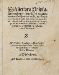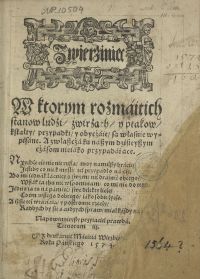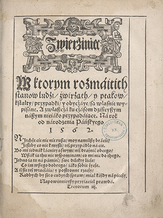 Zwierziniec W ktorym rozmaitich stanow ludzi, zwirząth, y ptakow, kstałty, przypadki, y obyczaie, są własnie wypisane, A zwłaszcza ku naszym dzisieyszym czasom nieiako przypadaiące. - [Wydanie 2]. - [Kraków] : Z drukarnie Macieia Wirzbięty, 1574. - [4], 1-2, [4 interfoliowane], 7-25, 32, 30, 31, 26, 33-40, 48-62, 64-95, 100-102, [4 interfoliowane], 108-116, 123-133 karty, sygnowanie A₁-3, 6, B₁, 2, 7, 8, C-D⁸, E₁, 2, 6-8, F⁸, H⁸, I₁-7, K-N⁸, O₁-3, P⁸, Q₁, 8, R⁸, S₂ : ilustracje ; 4°.